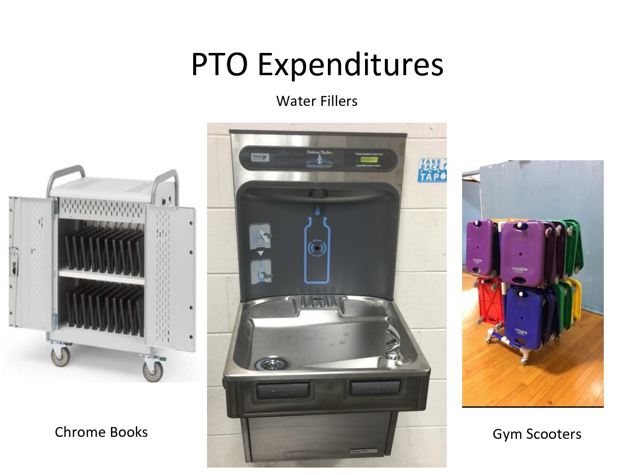 Purchases made by PTO: Chrome Books, Water Filler Stations, Gym Scooters